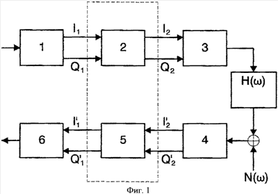 На фиг.1 показаны данные, подлежащие передаче; это основная полоса частот, модулированная посредством любой системы связи 1, кодированная в блоке 2 посредством ортогональных дополнительных последовательностей длиной N для получения новых сигналов основной полосы частот. Упомянутые сигналы могут быть модулированы в блоке 3 для направления к любым средствам передачи Н( ). В приемнике 4 сигналы с добавочным шумом N( ) демодулируются и сигналы основной полосы частот извлекаются вместе с шумом. Упомянутые сигналы 5 декодируются с использованием тех же ортогональных дополнительных последовательностей, так что на выходе процесса те же исходные сигналы со сниженной шумовой мощностью восстанавливаются в соответствии с длиной использованных последовательностей N и, следовательно, данные восстанавливаются в блоке 6 со сниженной долей ошибки.