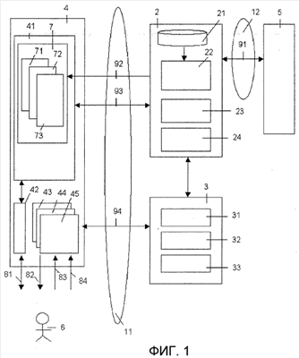 Фиг.1 показывает сети 11 и 12 связи, клиент 4, сервер 5 приложений, прокси-сервер 2 и мультимодальный сервер 3.