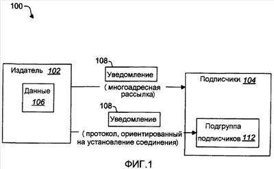 Система 100, представленная на фиг. 1, сконфигурирована для автоматического определения соответствующего транспортного механизма (т.е. посредством многоадресной рассылки или протокола, ориентированного на установление соединения) между издателем 102 и любыми подписчиками 104, которые заинтересованы в получении уведомляющих сообщений 108 о данных 106 издателя 102. В некоторый момент времени (например, когда издатель 102 начинает посылать уведомляющие сообщения 108 подписчикам 104), издатель 102 выполняет первоначальное определение касаемо того, посылать ли уведомляющие сообщения 108 посредством многоадресной рассылки или посредством протокола, ориентированного на установление соединения. В случае, когда издатель 102 не в состоянии поддерживать соединения со всеми подписчиками 104, издатель 102 может посылать уведомляющие сообщения 108 посредством многоадресной рассылки. Однако в случае, когда издатель 102 в состоянии поддерживать соединения со всеми подписчиками 104, издатель 102 может предпочесть посылку уведомляющих сообщений 108 посредством протокола, ориентированного на установление соединения.