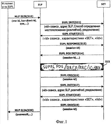 [58] Таким образом, когда от терминала «SET» поступает сообщение «SUPL START» или сообщение «SUPL POS INIT», указанная платформа определения местоположения «SLP» начинает процесс позиционирования «SUPL» и рассчитывает текущее местоположение терминала SET (S15). В этом случае платформа определения местоположения «SLP» или терминал «SET» могут несколько раз последовательно обмениваться сообщениями процесса позиционирования «SUPL» (например, RRLP/RRC/TIA-801) с помощью сообщения «SUPL POS». Здесь платформа определения местоположения «SLP» может рассчитать местоположение терминала «SET», принимая результаты измерений от терминала «SET» (с помощью мобильной станции «MS»), либо терминал «SET» может непосредственно рассчитать свое местоположение при содействии платформы определения местоположения «SLP» (на базе мобильной станции «MS»). Если терминал «SET» непосредственно рассчитывает свое местоположение, местоположение может рассчитываться с помощью датчика местоположения, установленного в терминале «SET» (например, блока расчета местоположения с помощью системы GPS или идентификатора ячейки).