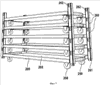 Для того чтобы обеспечить то, что при любом количестве подставок для хранения, положенных одна на другую, вставляемые концевые части нижней подставки для хранения, опирающиеся непосредственно на основание, не держат полный вес подставок для хранения, полезно выполнить прорези 262 в опорных средствах или прямоугольных трубках основания, в которые вставляемые концевые части самой нижней подставки для хранения могут выступать, не испытывая при этом нагрузки. Прорези 262 равнозначны, сами по себе, расширениям прорезей в стойках и, измеряя от верхних концов опорных средств 260, и имеют длину t, фигура 8, причем размеры задаются так, чтобы вставляемые концевые части нижней подставки для хранения, расположенной вверх дном на основании, не опираются на опорные средства. Выражение «расположена вверх дном» здесь обозначает положение, повернутое на 180° относительно ее продольной оси по отношению к нормальному положению, используемому при хранении растений и поливе; «вверх дном» означает, что ее верхняя часть направлена вниз и вставляемые концевые части направлены противоположно тому, как они направлены в положении для использования.