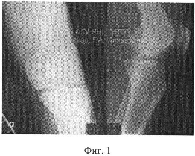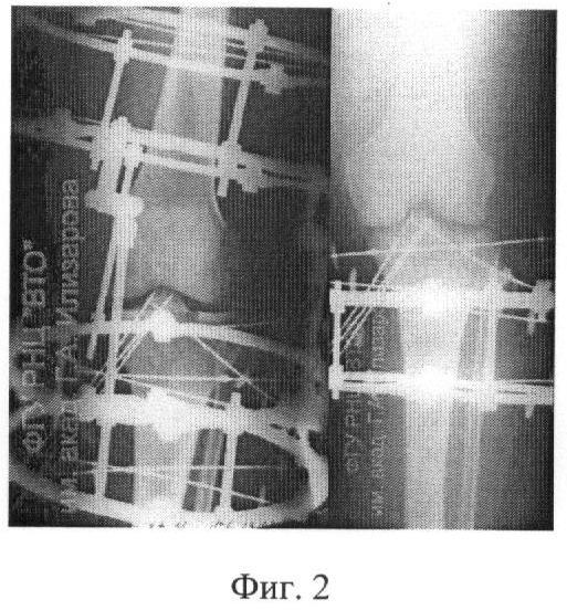Фиг.2 – рентгенограмма коленного сустава больного Р. в процессе фиксации аппаратом;