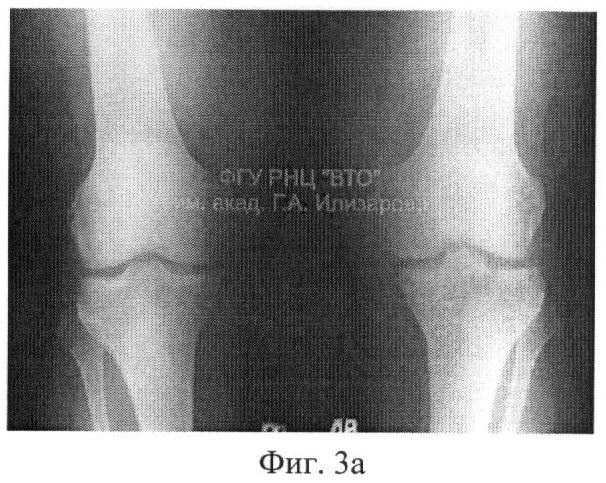 На второй день после операции больному назначали ходьбу с помощью костылей с постепенно возрастающей нагрузкой на оперированную конечность. Через две недели назначали курс ЛФК с активно-пассивной разработкой движений в коленном суставе, которую продолжали в течение 51 дня до консолидации перелома (фиг.3). На момент выписки амплитуда активных движений в коленном суставе составляла: при сгибании – до 90 градусов, при разгибании – полное; на контрольно осмотре через 1 год – в пределах нормы.