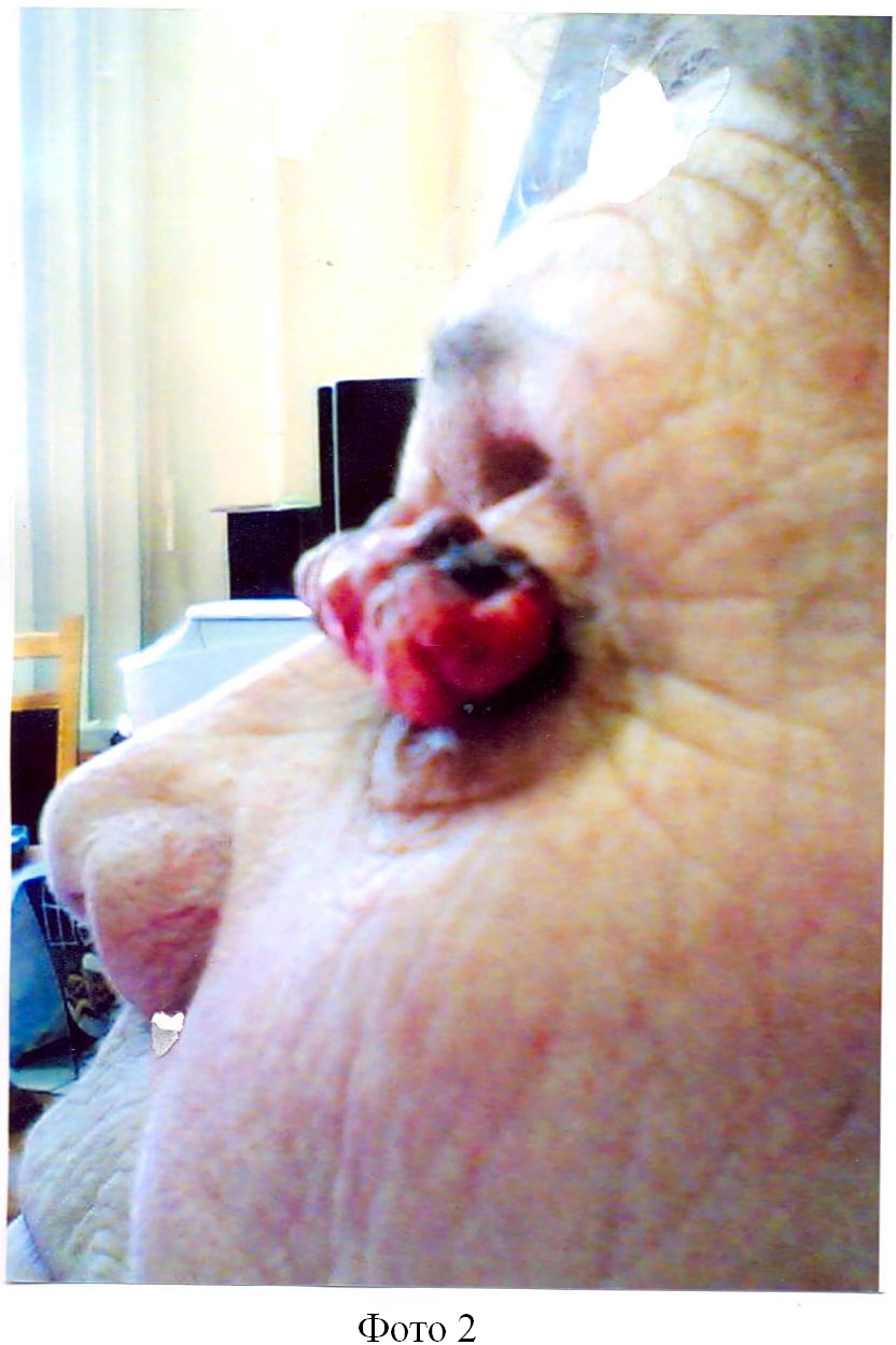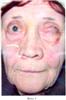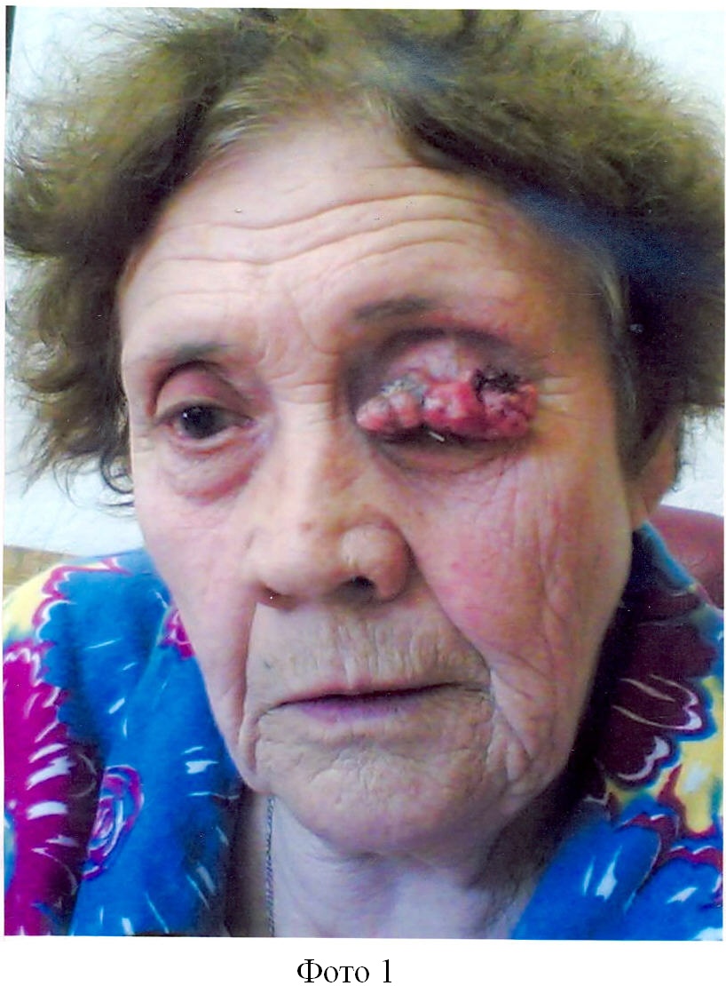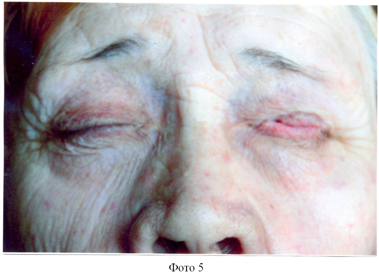 Пример 1. Больная Ш., 78 лет, поступила в глазное отделение больницы Сев.Кав.Жел.Дор. с диагнозом базально-клеточный рак верхнего века. Опухоль занимала все верхнее веко размером 35×18×16 мм (фото 1, 2). После удаления опухоли вместе с верхним веком в пределах здоровой ткани зияющую глазную щель ликвидировали сшиванием остатков тканей верхнего века с реберным краем нижнего века (блефарорафия, фото 3). Через 2,5 месяца произвели сквозное рассечение нижнего века вдоль хряща, отступя 4-5 мм книзу от рубца, соединяющего нижнее веко с остатками тканей верхнего века. Больная сразу на операционном столе продемонстрировала смыкание и раскрывание глазной щели. На реберный край век пересажены полоски слизистой, взятой с губы, и фиксированы непрерывными швами 8-0 (по Сапежко). Швы сняты через 7 дней (фото 4, 5).