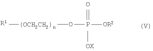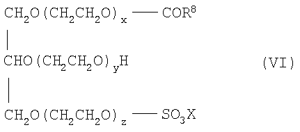 в которой R1 и R2 независимо друг от друга означают атом водорода, катион щелочного или щелочноземельного металла, группу аммония, катион аммоний-органического основания или остаток Z, который получен из полигидроксилированного органического соединения, которое выбирают из группы переэтерифицированного алкилполисахарида с 6-18 атомами углерода с 1-6 мономерными элементами сахарида и/или переэтерифицированных алифатических гидроксиалкилполиолов с 6-16 атомами углерода с 2-16 остатками гидроксила, при условии, что, по крайней мере, одна из групп R1 и R2 означает остаток Z, – сложные моно- и диалкиловые эфиры сульфоянтарной кислоты с 8-24 атомами углерода в алкильной группе и сложный моноалкилполиоксиэтиловый эфир сульфоянтарной кислоты с 8-24 атомами углерода в алкильной группе и 1-6 этоксигруппами, – сложные эфиры винной кислоты и лимонной кислоты со спиртами, которые представляют продукты присоединения, например, 2-15 молекул этиленоксида и/или пропиленоксида к жирным спиртам с 8-22 атомами углерода, – линейные и разветвленные жирные кислоты с 8-30 атомами углерода (мыла), – эфиркарбоновые кислоты формулы R-O-(CH2-CH2O)x-CH2-COOH, в которой R означает линейную алкильную группу с 8-30 атомами углерода и х равно 0 или от 1 до 16, – ацилсаркозинаты с линейным или разветвленным остатком ацила с 6-22 атомами углерода и 0, 1, 2-или 3 двойными связями, ацилтаураты с линейным или разветвленным остатком ацила с 6-22 атомами углерода и 0, 1, 2 или 3 двойными связями, – ацилизетионаты с линейным или разветвленным остатком ацила с 6-22 атомами углерода и 0, 1, 2 или 3 двойными связями, – линейные алкансульфонаты с 8-24 атомами углерода, – линейные альфа-олефинсульфонаты с 8-24 атомами углерода, – сложный метиловый эфир альфа-сульфожирной кислоты на основе жирных кислот с 8-30 атомами углерода, – алкилсульфаты и алкилполигликольэфирсульфаты формулы R-O(СН2-СН2O)z-SО3Х, в которой R предпочтительно означает линейную алкильную группу с 8-30 атомами углерода, особенно предпочтительно с 8-18 атомами углерода, z равно 0 или от 1 до 12, особенно предпочтительно 3, и X означает ион натрия, калия, магния, цинка, аммония или ион моноалканоламмония, диалканоламмония или триалканоламмония с 2-4 атомами углерода в алканольной группе, причем особенно предпочтительным примером является кокоилэфирсульфат цинка со степенью этоксилирования Z равно 3, – смеси поверхностно-активных гидроксисульфонатов согласно немецкой заявке на патент DE 3725030, – сульфатированные простые гидроксиалкилполиэтиленгликолевые эфиры и/или гидроксиалкиленпропиленгликолевые эфиры согласно немецкой заявке на патент DE 3723354, – сульфонаты ненасыщенных жирных кислот с 8-24 атомами углерода и 1-6 двойными связями согласно немецкой заявке на патент DE 3926344, – алкил- и/или алкенилэфирфосфаты формулы (V) в которой R1 предпочтительно означает алифатический остаток углеводорода с 8-30 атомами углерода, R2 означает водород, остаток (CH2CH2O)nR1 или X, n равно числам от 1 до 10 и Х означает водород, ион щелочного или щелочноземельного металла или NR3R4R5R6, где R3-R6 независимо друг от друга означают остаток углеводорода с 1-4 атомами углерода, – сульфатированные сложные алкилгликолевые эфиры жирной кислоты формулы R7CO(AlkO)nSO3M, в которой R7CO означает линейный или разветвленный, алифатический, насыщенный и/или ненасыщенный остаток ацила с 6-22 атомами углерода, Alk означает С