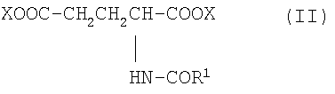 в которой R1CO означает линейный или разветвленный остаток ацила с 6-22 атомами углерода и 0, 1, 2 или 3 двойными связями и Х означает водород, щелочной и/или щелочноземельный металл, аммоний, алкиламмоний, алканоламмоний или глюкаммоний, например, ацилглютаматы, которые являются производными от жирных кислот с 6-22, предпочтительно с 12-18 атомами углерода, как, например, кокосовая жирная кислота с 12-14 или 12-18 атомами углерода, лауриновая кислота, миристиновая кислота, пальмитиновая кислота и/или стеариновая кислота, в частности натрий-N-кокоил-L-глютамат и натрий-N-стеароил-L-глютамат, сложные эфиры гидроксизамещенной ди- или трикарбоновой кислоты общей формулы (III),
