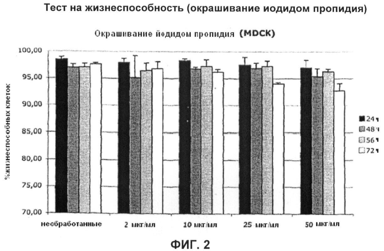 Зависящее от концентрации ингибирование размножения вируса в клетках MDCK наблюдали также для используемого в качестве альтернативы штамма вируса человека PR8 при всех изученных временных интервалах. В этом случае также происходило уменьшение титров вируса при самой высокой концентрации активного агента 50 мкг/мл, что согласуется с предыдущими экспериментами.
