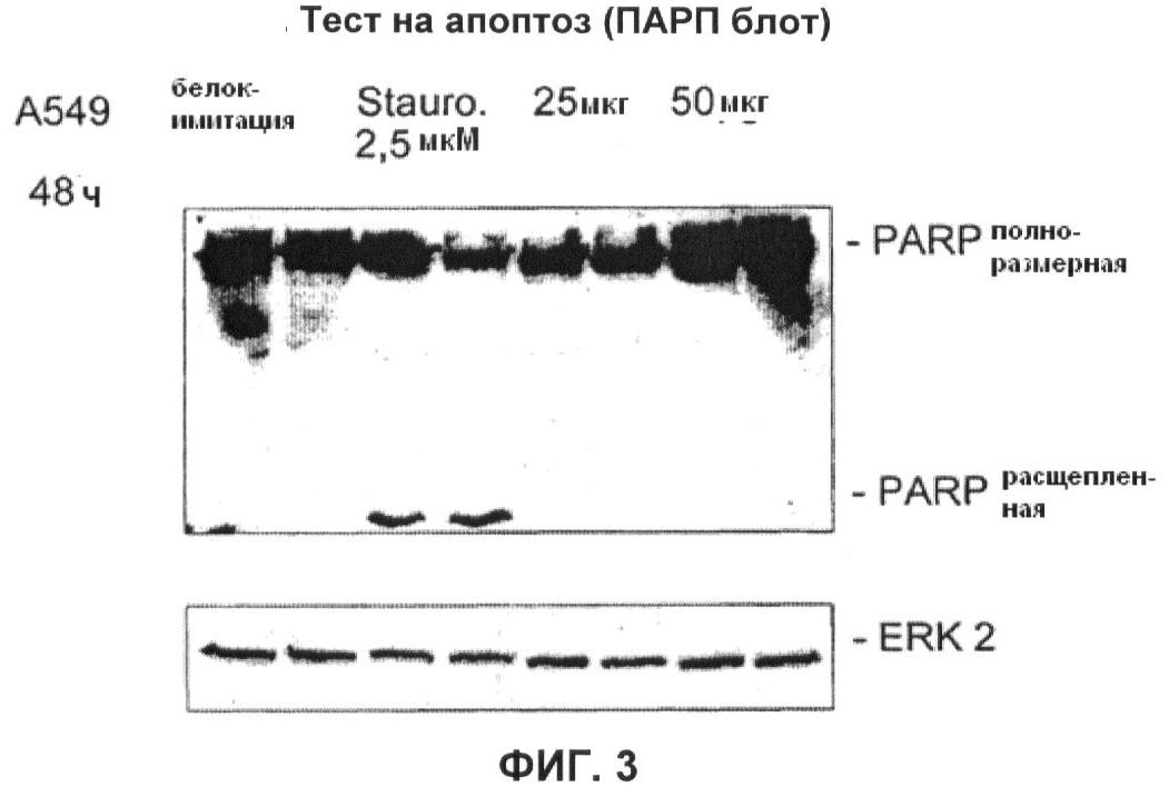 Результаты исследования активации каспаз апоптоза показаны на Фиг.3, которая иллюстрирует результаты анализа методом Вестерн-блот для определения активности каспаз. В то время как контрольный стимул стауроспорин (stauro) обеспечивает эффективное расщепление субстрата каспаз (поли(АДФ-рибоза)полимеразы, полоса расщепленного ПАРП), ни в необработанных (обработанных контрольным раствором, mock), ни в обработанных экстрактом (25 мкг/мл, 50 мкг/мл) клетках, активности такого рода не обнаружили. Контрольный блот против белка ERK2 служил в качестве контроля равномерности белковой нагрузки. В качестве результата можно сделать заключение, что обработка экстрактом растений не приводит к активации каспаз и индукции апоптоза при использованных концентрациях и длительности периода наблюдения.