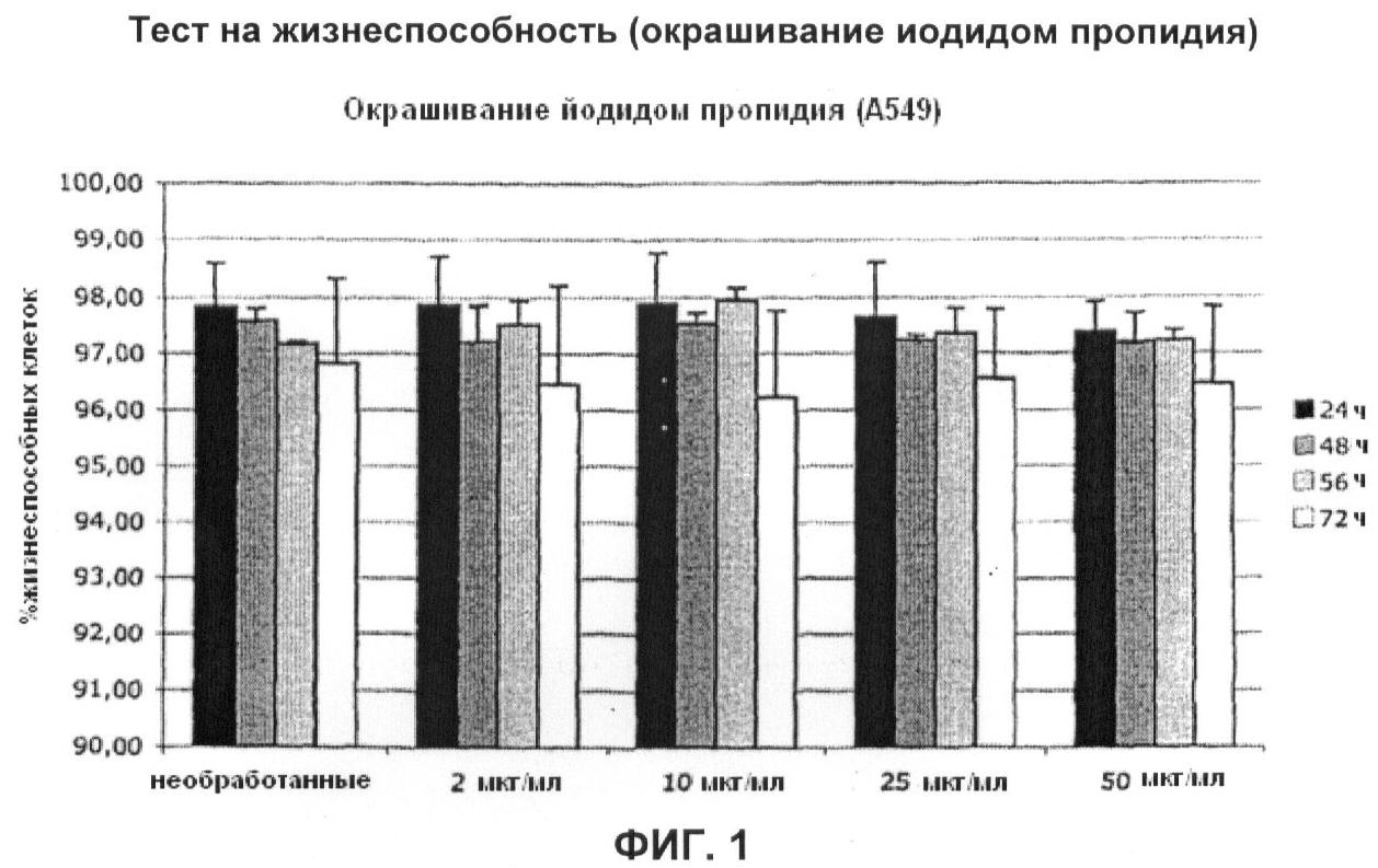 Результаты теста на жизнеспособность показаны на Фиг.1 и 2, на которых для сравнения суммированы количества живых клеток в каждом из соответствующих образцов в виде средних по четырем проведенным измерениям. Из полученных результатов видно, что никакого отрицательного влияния экстракта на выживание клеток MDCK или клеток А549 на протяжении всего периода наблюдения 72 часа не обнаружено.