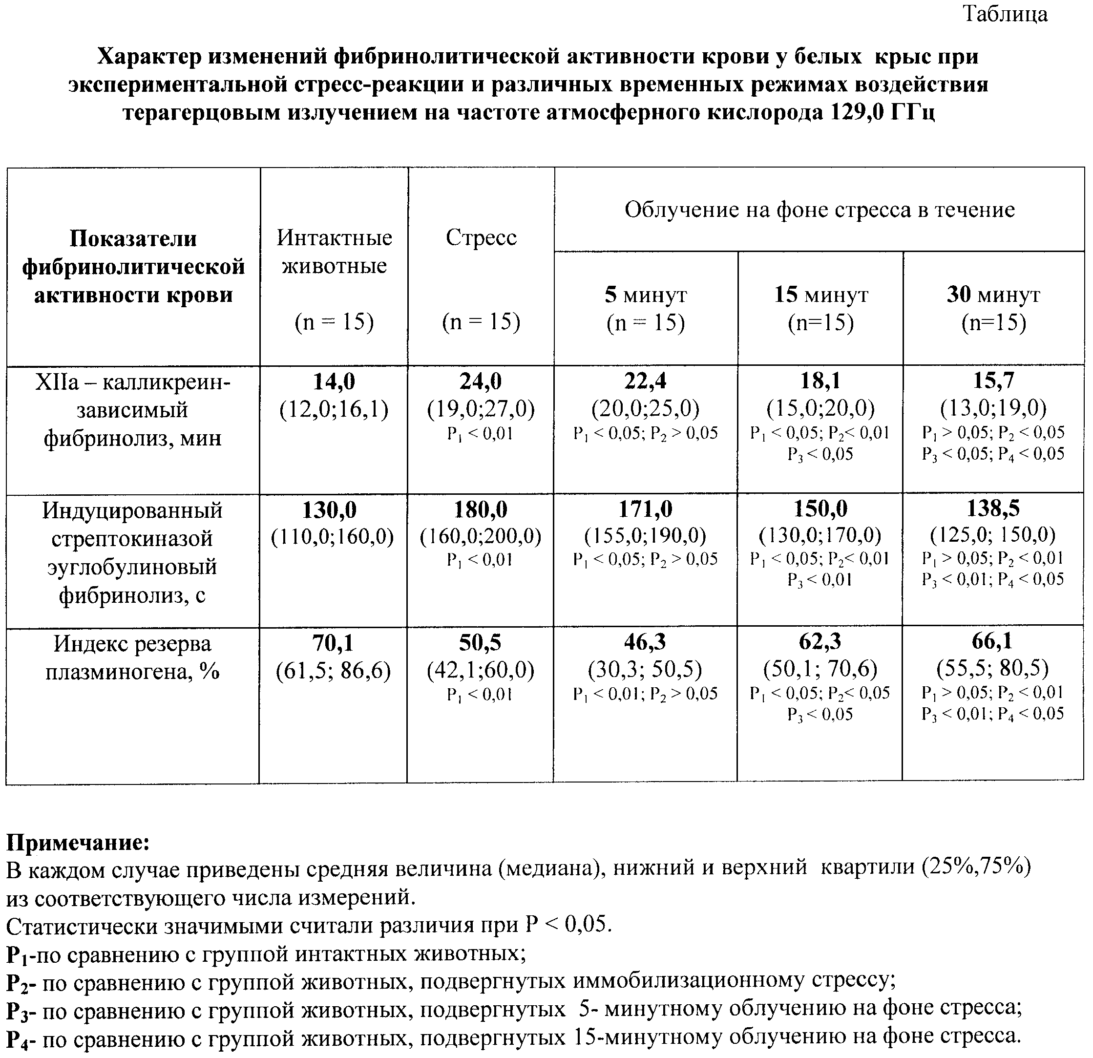 Нами впервые предложен способ восстановления нарушенной фибринолитической активности крови в эксперименте путем воздействия на область грудины терагерцовыми волнами на частоте молекулярного спектра излучения и поглощения атмосферного кислорода 129,0 ГГц при плотности мощности ~ 100 мВт/см2 в течение 30 минут. Изучали образцы крови 75 белых беспородных крыс-самцов массой 180-220 г. В качестве модели, имитирующей нарушения процесса фибринолиза, применяли острый трехчасовой иммобилизационный стресс – фиксация крыс в положении на спине в течение 3 часов (Киричук В.Ф., Антипова О.Н., Креницкий А.П., Тупикин В.Д., Майбородин А.В., Бецкий О.В., Иванов А.Н., Цымбап А.А., Помошникова О.И. Способ профилактики и коррекции стрессорных повреждений организма. Патент РФ Исследование проводилось в 5-ти группах животных по 15 особей в каждой: 1 группа – контрольная – интактные животные; 2 группа – группа сравнения, животные в состоянии острого иммобилизационного стресса; 3, 4 и 5 группы – опытные, в которых животные подвергались однократному облучению в течение 5, 15 и 30 минут соответственно на фоне иммобилизации. Для устранения влияния сезонной и циркадной зависимости на показатели фибринолиза эксперименты проводились в осенний период в первой половине дня. Все животные при проведении эксперимента находились в одинаковых условиях. Однократное облучение области мечевидного отростка грудины животных, находящихся в состоянии острого иммобилизационного стресса, проводилось электромагнитными волнами терагерцового диапазона на частоте молекулярного спектра излучения и поглощения атмосферного кислорода 129,0 ГГц, при плотности мощности ~ 100 мВт/см2, заданной генератором КВЧ-О2, разработанным впервые в ОАО «Центральный научно-исследовательский институт измерительной аппаратуры» (г.Саратов) совместно с ФГУП «НПП-Исток» г.Фрязино и Медико-технической ассоциацией КВЧ г.Москва (Патент на полезную модель Забор крови для исследования фибринолитической активности крови осуществляли в пластиковые пробирки путем пункции сердца. В качестве стабилизатора крови использовался 3,8%-ный раствор цитрата натрия в соотношении 9:1. Фибринолитическую активность крови исследовали с помощью Хагеман-калликреин-зависимого фибринолиза, индуцированного стрептокиназой эуглобулинового фибринолиза, расчетом индекса резерва плазминогена с использованием реактивов фирмы НПО “РЕНАМ” (г.Москва, Россия), «Технология-Стандарт» (г.Барнаул, Россия). При анализе результатов исследования показано, что у крыс, находящихся в состоянии острого иммобилизационного стресса, наблюдались статистически достоверное угнетение активности Хагеман-зависимого и индуцированного стрептокиназой эуглобулинового фибринолиза, а также снижение индекса резерва плазминогена (таблица). Таким образом, при иммобилизационном стрессе происходит снижение активности фибринолитической системы организма, что требует несомненно коррекции (таблица). Воздействие терагерцового излучения на частоте молекулярного спектра излучения и поглощения атмосферного кислорода 129,0 ГГц при плотности мощности ~ 100 мВт/см2 в течение 5-ти минут на животных, находящихся в состоянии острого иммобилизационного стресса, не вызывало значительного изменения нарушенных показателей фибринолитической активности крови, что подтве