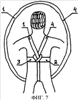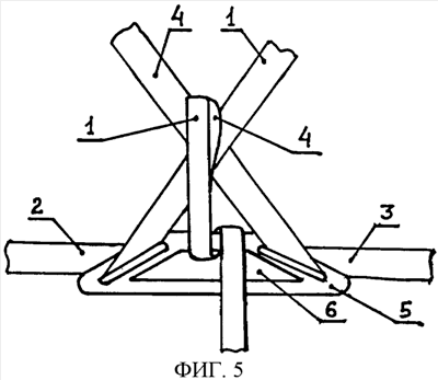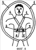 Спасательный пояс по а.с. СССР 1581329, класс А62В 35/00 (фиг.1), представляет собой пряжку 5 в виде равнобочной трапеции с пазами вдоль ее боковых сторон и центральным отверстием 6, причем пазы образуют угол 105°-115°, а ремень 1, 2, 3, 4 свободно пропущен через пазы и закольцован. Указанный угол позволяет избавиться от концентрации напряжений в ветвях ремня, в результате чего ремень нагружается по всей его длине равномерно и его разрушение, при прочих равных условиях, начнется при большей нагрузке, чем разрушение ремня в спасательном поясе по а.с. 1391660. Спасательный пояс (фиг.1) крепится на спасаемом человеке следующим образом. Ветви ремня 2, 3, образующие полукольцо (фиг.1) с одной из сторон пряжки, одевают через голову и охватывают ими тело спасаемого (фиг.2, 3) вокруг талии, выбирают лишнюю длину ремней 1, 4 из пряжки 5, которую прижимают к телу, выбранные ремни крестообразно (фиг.2) на груди пропускают через плечи, по спине, между ног (фиг.3) и далее через центральное отверстие 6 в пряжке 5 с охватом верхнего края пряжки на один оборот (фиг.4, 5). После этого спасаемый человек готов к спуску, который осуществляют, предварительно пропустив карабин спасательной веревки (не показаны) через петлю спасательного пояса, образованную ветвями ремня 1, 4 (фиг.5).