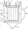 На фиг.2 показана схема горизонтального пластинчатого электрофильтра, продольный разрез последнего электрического поля. Здесь 1 – корпус электрофильтра, 2 – балка встряхивания осадительного электрода, 3 – осадительный электрод, 4 – коронирующий электрод, 5 – балка подвеса осадительного электрода, 6 – трубопровод хладагента, 7 – изолятор, 8 – диффузор, 9 – бункер.