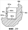 Сначала обратимся к фиг.22, на которой показано гнездо 621 в корпусе 603 распылителя с подачей жидкости самотеком, неимеющее резьбы. Гнездо 621 имеет цилиндрическую внешнюю часть канала 621а и цилиндрическую внутреннюю часть канала 621b, соединенные внутренним кольцевым плечиком 621с. Внутренняя часть канала 621b имеет диаметр меньший, чем внешняя часть канала 621а. В нижней части гнезда 621 имеется уплотняющая поверхность 621d, назначение которой будет описано позже.