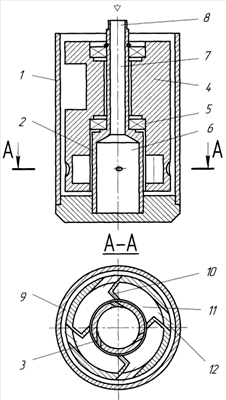 Основным недостатком этого вибровозбудителя является сложное конструктивное исполнение из-за наличия дополнительных элементов и каналов системы распределения энергоносителя, а также сравнительно низкое использование внутреннего пространства корпуса, вызванного расположением втулки с тангенциальными соплами в последнем.