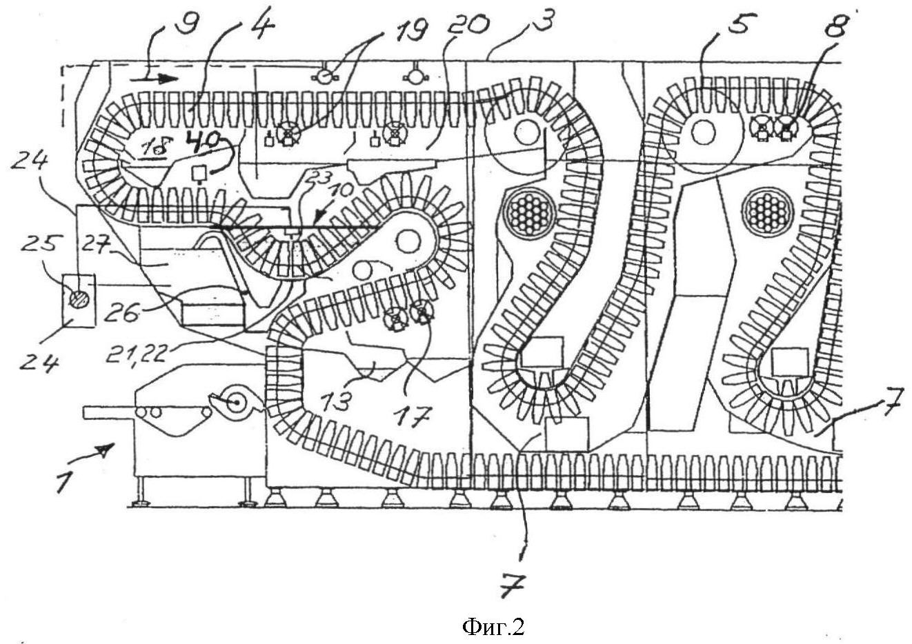 На фиг.1 изображена очистительная машина одноконцевой конструкции. В соответствии с этим бутылкозагрузочное 1 и бутылкоразгрузочное 2 устройства находятся на одной торцевой стороне корпуса 3 машины. Внутри этого корпуса закреплены бутылкодержатели с бутылочными ячейками 4 на циркулирующих цепях 5. Цепи направляют бутылочные ячейки 4 с находящимися в них бутылками через отдельные обрабатывающие секции. Они состоят преимущественно из зоны 6 предварительного замачивания с последующими щелочными ванными 7, за которой следуют изображенные лишь частично различные зоны 8 главного и дополнительного орошения.