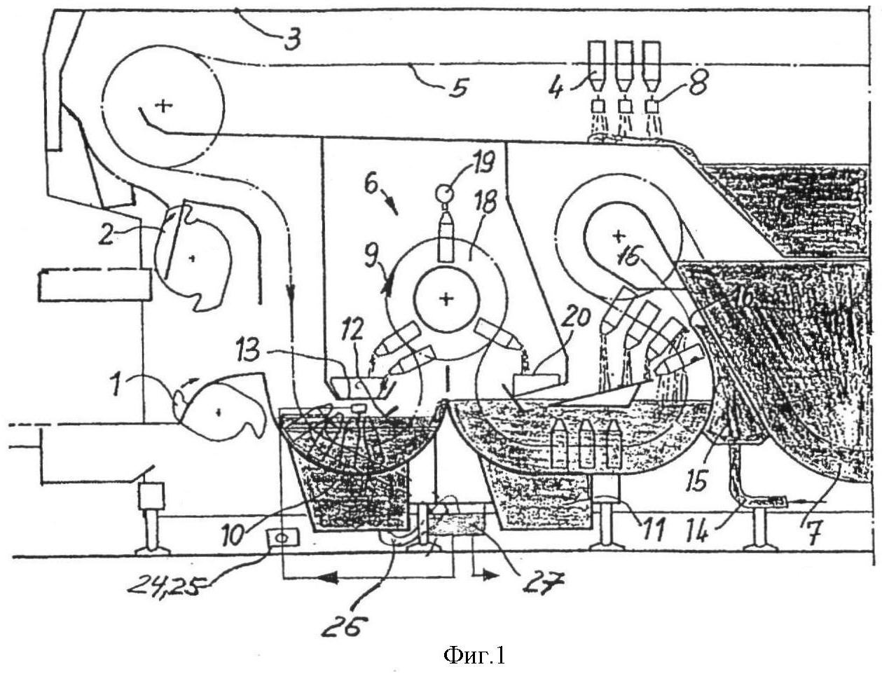 В примерах на фиг.1 и 2 под ванной 10 предварительного замачивания выполнен сифонообразный направляющий канал 26, конец которого проходит в зоне уровня бака 27 для этикеток и слива остатков. Активное течение происходит при этом, по меньшей мере, частично за счет перекачивания находящейся в баке 27 для этикеток и слива остатков циркулирующей жидкости посредством оросительно-всасывающего устройства 24. Оно может быть создано также в зависимости от выполнения и соответствия по высоте за счет возникающей разности уровней между ванной 10 предварительного замачивания и баком 27. Бак 27 может быть выполнен при этом в виде дополнительного сборно-циркуляционного бака для последующих оросительных устройств 19 или волнонагонных устройств или использоваться частично.