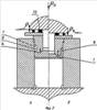 2. Изготавливалась аналогичная деталь 1 диаметром наружным Dн=430 мм, диаметром внутренним Dвн=380 мм из сплава В-96ц. Исходная подготовленная заготовка имеет d=360 мм, при этом деформирующие поверхности 9 дорна 3 и подвижного пуансона 8 как в первом, так и во втором примере были выполнены плоскими, а деформирующая торцевая поверхность 10 кольцевого дорна 6 была выполнена вогнутой, с углом наклона образующей относительно плоского торца дорна 3, равным 20°. Начальные стадии процесса аналогичны приведенным на фиг.1а, б и 2а. Однако третья стадия – выдавливание металла шайбы, осуществлялось в две кольцевые полости (фиг.3а, б):
