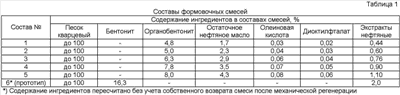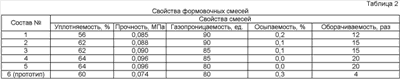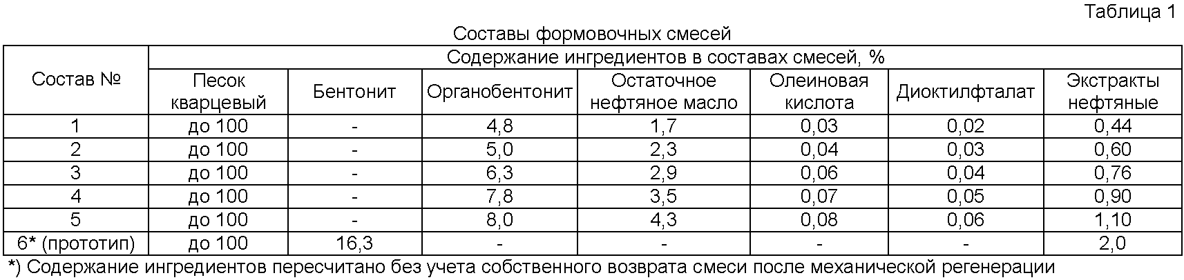 Органобентонит представляет собой обработанный четвертичной аммониевой солью бентонит и является структурообразователем масляных сред, его введение обусловлено необходимостью повышения коллоидной стабильности смеси, содержащей остаточное нефтяное масло. Остаточное нефтяное масло с олеиновой кислотой и диоктилфталатом в указанном соотношении позволяет существенно повысить оборачиваемость безводной формовочной смеси за счет образования более прочных дисперсионных связей с молекулами органобентонита. Безводную формовочную смесь изготавливают путем загрузки в смеситель расчетного количества сухих компонентов кварцевого песка, органобентонита и последующего перемешивания в течение 2-4 мин до получения однородной массы, затем в смеситель добавляют расчетное количество предварительно смешанных углеводородных составляющих: остаточного нефтяного масла, экстракта нефтяного, олеиновой кислоты и диоктилфталата, содержимое перемешивают еще раз в течение 16-18 мин. В качестве огнеупорного наполнителя в предлагаемых безводных смесях используется песок кварцевый мелкой фракции марки 1К1О3016 по ГОСТ 2138-84. Связующим веществом в смеси служит органобентонит по ТУ 95 2752-2000. В качестве дисперсионной углеводородной среды применяется смесь остаточного нефтяного масла (ТУ 38.101760-82), экстрактов нефтяных (ТУ 0258-018-48120848-2002), олеиновой кислоты (ТУ 9145-172-4731297-94) и диоктилфталата (ГОСТ 8728-88). Ниже представлены составы (табл.1) и свойства (табл.2) безводных формовочных смесей. Уплотняемость, прочность, газопроницаемость, осыпаемость определяли по ГОСТ 23409-78. Оценка оборачиваемости проводилась по специально разработанной методике. Образцы из изготовленной формовочной смеси подвергали тепловой обработке при температуре 110°С в течение 1 ч, затем контролировали по следующим параметрам – уплотняемость, прочность при сжатии, газопроницаемость, осыпаемость. Оборачиваемость смеси оценивалась по изменению контролируемых свойств относительно исходных. Смесь, прошедшая большее количество оборотов с наименьшими «падениями» свойств относительно исходных, считалась более склонной к сохранению исходных свойств, т.е. более оборотистой. Из таблицы 2 следует, что составы При содержании в смеси данных компонентов меньше нижнего предела (состав