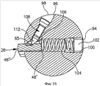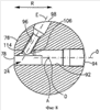 Обратим внимание теперь на фиг.9 и 10. Режущая пластина 28 установлена с возможностью перемещения в гнезде 24, при этом направляющий элемент 74 взаимодействует с направляющим пазом 54, а главная часть 56 режущей пластины 28 расположена в прямоугольном в основном пазу 72. Главное отверстие на заднем конце 92 вблизи второго выхода 94 имеет резьбовую часть 100, в которую заворачивается первый винт 102. Пружина 104 в виде винтовой пружины сжатия расположена в главном отверстии 92 между первым винтом 102 и режущей пластиной 28 для поджатия ее радиально наружу через первый выход 78 с определенным усилием. Пружина 104 контактирует с внутренней торцовой поверхностью 48′ режущей пластины 28. Внутренней является торцовая поверхность 48′, обращенная радиально внутрь гнезда 24 и противолежащая наружной торцовой поверхности 48”, обращенной радиально наружу в направлении от гнезда 24. Усилие, прикладываемое пружиной 104, может регулироваться путем регулирования положения первого винта 102, который действует также как пробка, чтобы предотвратить выход пружины 104 из главного отверстия 92 через второй выход 94.