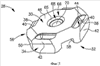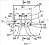 Вспомогательная средняя плоскость Р2 является продольной средней плоскостью направляющего паза 54, разделяющей его в продольном направлении. Режущая пластина 28 имеет главную часть 56, в которой образован направляющий паз 54. Направляющий паз 54 включает плоские опорные поверхности 58, расположенные с разных сторон от вспомогательной средней плоскости Р2, проходящие внутрь от частей 52 нижней поверхности и соединяющиеся с поверхностью дна 60, расположенной между ними. Следует отметить, что, как будет описано ниже, каждая боковая поверхность 50 имеет первую длину L1 (см. фиг.6), а направляющий паз 54 имеет вторую длину L2, указанные длины измерены в направлении продольной оси В направляющего паза 54, причем первая длина L1 меньше, чем вторая длина L2.