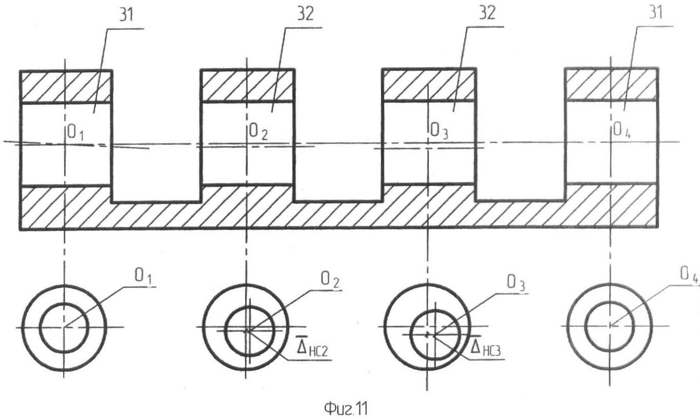 На фиг.11 представлено продольное сечение обрабатываемой детали (картера) и вид смещенных на величину регулярной несоосности н.с2. и н.с3. центров О2, О3 промежуточных растачиваемых отверстий относительно общей оси крайних растачиваемых отверстий, проходящей через центры О1 и О4.