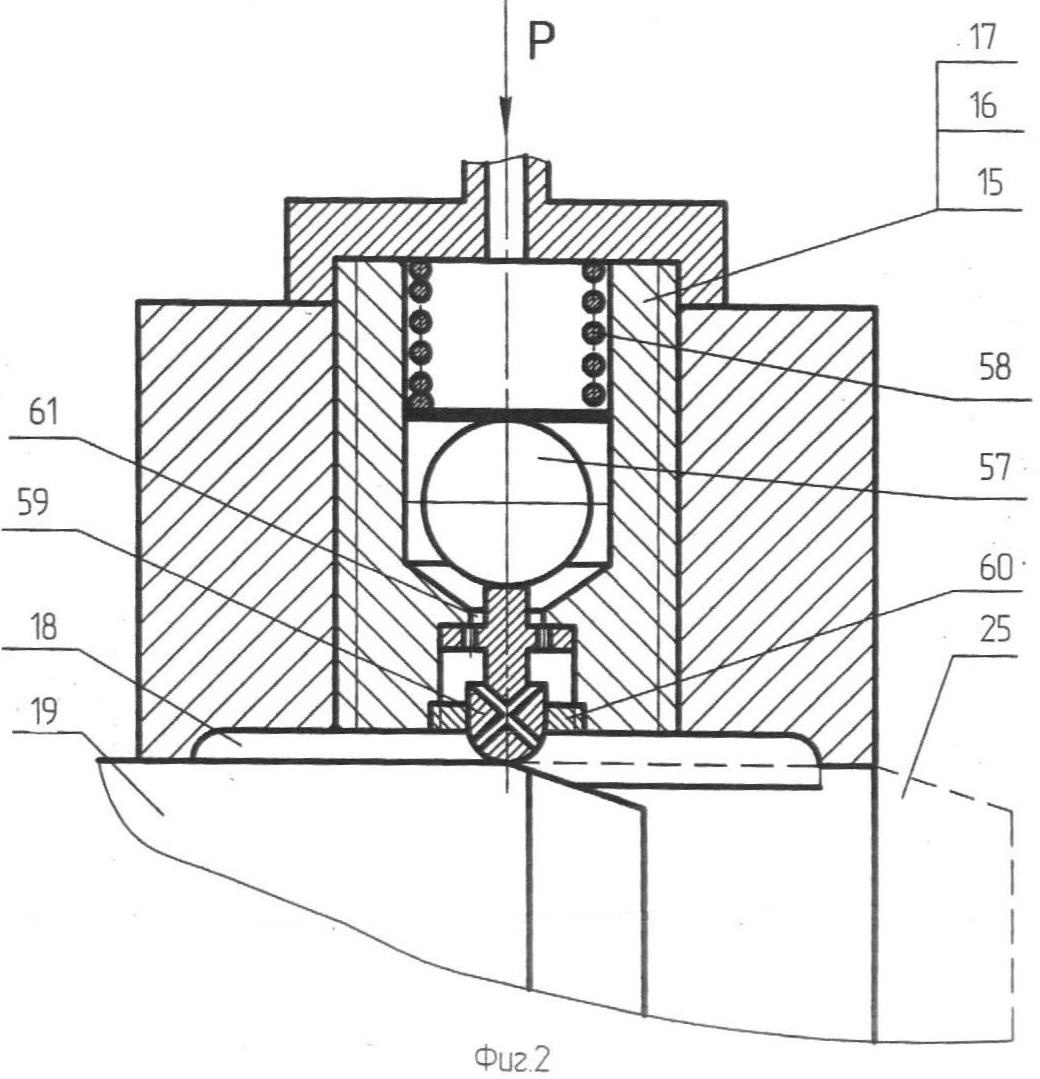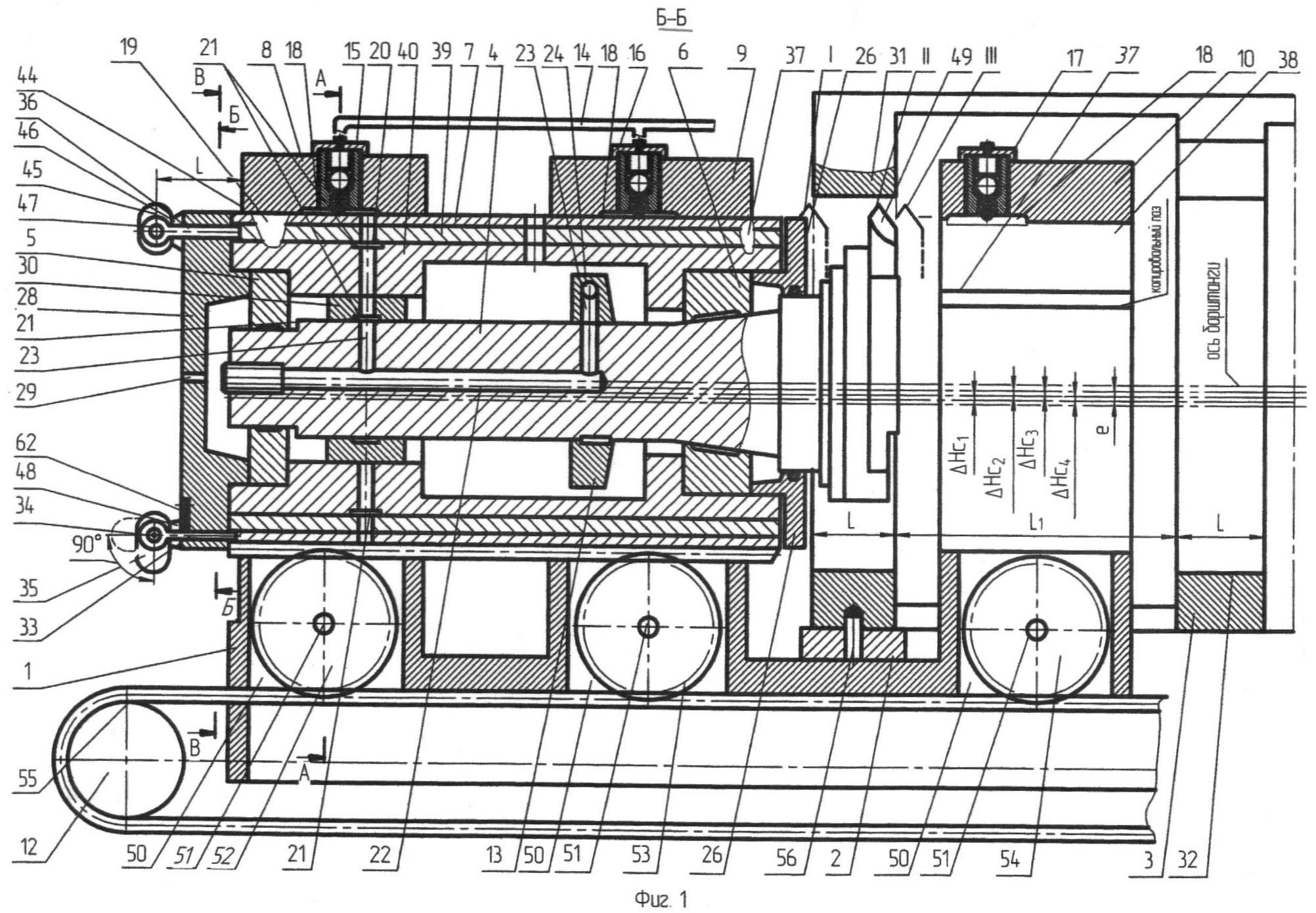 Борштанга 4 установлена во внутренней втулке 40, содержит резец 49, а встроенная пневматическая реактивная турбина 13 закреплена жестко на борштанге 4. Люнеты 8, 9, 10, 11 имеют одинаковые внутренние полости 50, в которых на осях 51 помещены приводные элементы 52, 53, 54. Вращение приводных элементов 52, 53, 54 может осуществляться от зубчатой ременной передачи 55, связанной с приводом 12. Обрабатываемая деталь 3 (например, блок цилиндров или картер двигателя внутреннего сгорания) установлена на базовые пальцы 56 и содержит крайние растачиваемые отверстия 31 и промежуточные растачиваемые отверстия 32, которые по очереди растачиваются резцом 49 при вращении борштанги 4 и поступательном прямолинейном ее перемещении вместе с гильзой 7. Передняя крышка 26 и задняя крышка 28 служат для закрепления подшипников 5 и 6, а задняя крышка 28, кроме того, служит для сброса через выходное отверстие 29 отработанного воздуха из полости внутренней втулки 40 наружу. К люнетам 8, 9, 10, 11 выполнен подвод воздуха от внешнего воздушного трубопровода 14 через запорные клапаны 15, 16, 17 так, что он периодически сообщается с воздушными радиальными отверстиями 20 в гильзе 1 и через радиальные 23, кольцевые 21 внутренней втулки 40, промежуточного кольца 30 и осевым 22 каналами борштанги 4 с соплами 24 турбины 13. Перепуск воздуха от внешнего воздушного трубопровода 14 через запорные клапаны 15, 16, 17 (фиг.2), шарики 57, после сжатия пружин 58 путем перемещения пустотелого штока 59, который ограничен в осевом перемещении резьбовой втулкой 60 и может утапливаться фаской 25 гильзы 7 так, что, воздействуя на шарик 57, заставляет его открыть запираемый им канал 61, по которому сжатый воздух может поступать в полость замкнутых канавок 18 и далее на турбину 13.