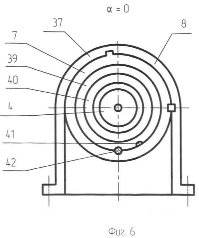 При этом промежуточная втулка 39 выполнена с возможностью смещения на величину регулярной несоосности н.с.=0,4 мм (нормируемый допуск на эту величину составляет ±0,03 мм). Пример расположения промежуточных растачиваемых отверстий 32 ряда относительно крайних растачиваемых отверстий 31 показан на фиг.11. Достигается это путем поворота промежуточной втулки 39 до совмещения одного из ее фиксирующих полуотверстий 41 (фиг.6-9), расположенных на ее наружной поверхности контакта с гильзой 7 с фиксирующим полуотверстием 42, расположенным на внутренней поверхности гильзы 7 (фиг.6, 7) и ее фиксации относительно гильзы 7 с величиной регулярной несоосности н.c2.= н.с3=0,4±0,03 мм промежуточных растачиваемых отверстий 32. При этом промежуточная втулка 39 установлена с возможностью образования общего отверстия 43, полученного из фиксирующих полуотверстий 41 и 42, выполненных в разъеме цилиндрических поверхностей контакта промежуточной втулки 39 и гильзы 7 после поворота промежуточной втулки 39 и ее радиального смещения на величину регулярной несоосности н.с2.=0,4±0,03 мм от воздействия на промежуточную втулку 39 соединенного с ней копирного пальца 36, взаимодействующего с участками 38 копировального паза 37 люнетов, соответствующими промежуточным растачиваемым отверстиям с регулярной несоосностью и производящим это воздействие при осевом перемещении гильзы в каждом из люнетов 8, 9, 10, а копировальный паз 37 выполнен так, что проекция профиля выхода копировального паза 37 каждого предыдущего люнета 8, 9, на торец последующего люнета 9, 10 совпадает с проекцией профиля входа каждого копировального паза последующего люнета 9 и 10 (фиг.10), копирный палец 36 установлен на задней крышке 28, содержащей подпружиненный стопор 33, а фиксирующие полуотверстия 42 гильзы 7 и фиксирующие отверстия 41 промежуточной втулки 39 в разъеме цилиндрических поверхностей контакта между ними, попарно образуют периодически общие отверстия 43, взаимодействующие с подпружиненным стопором 33 (фиг.6-9).