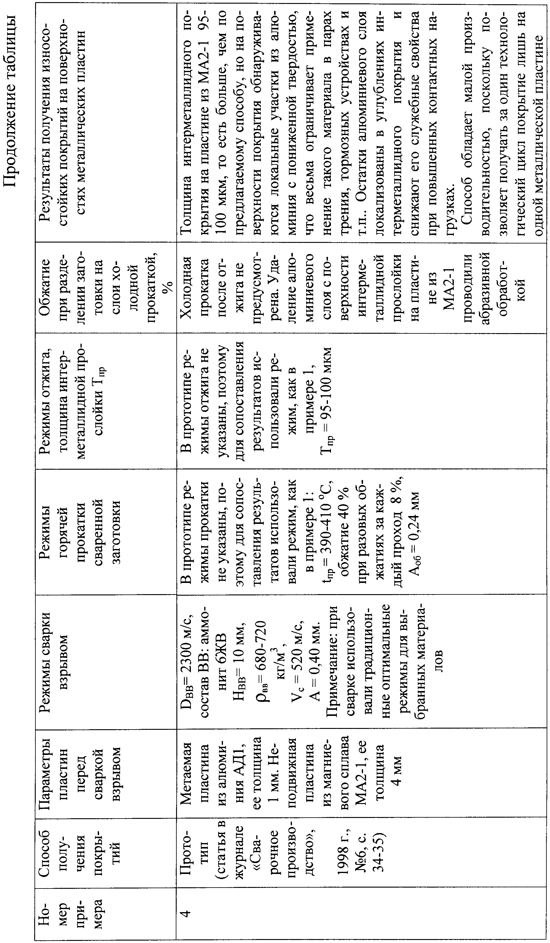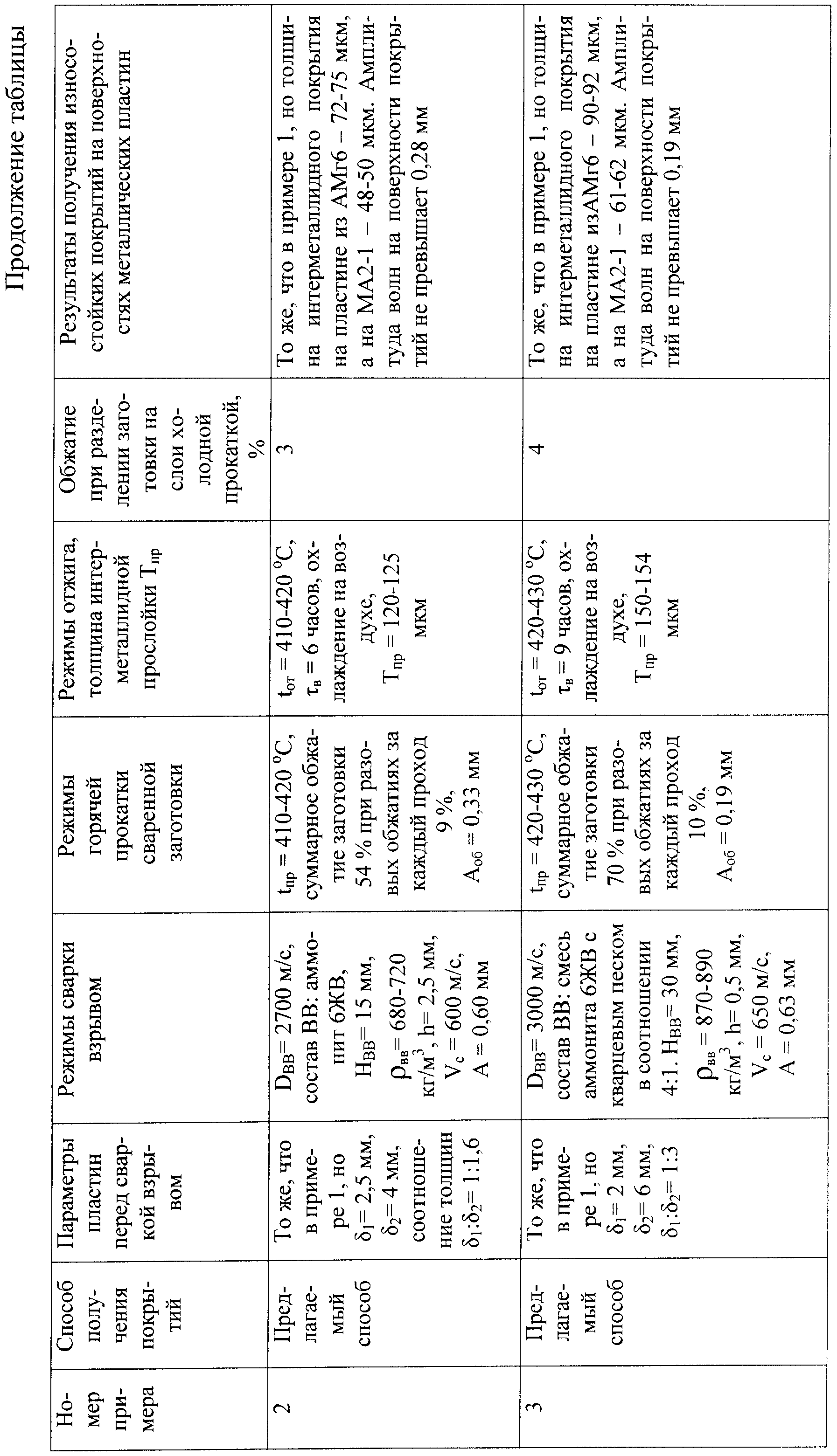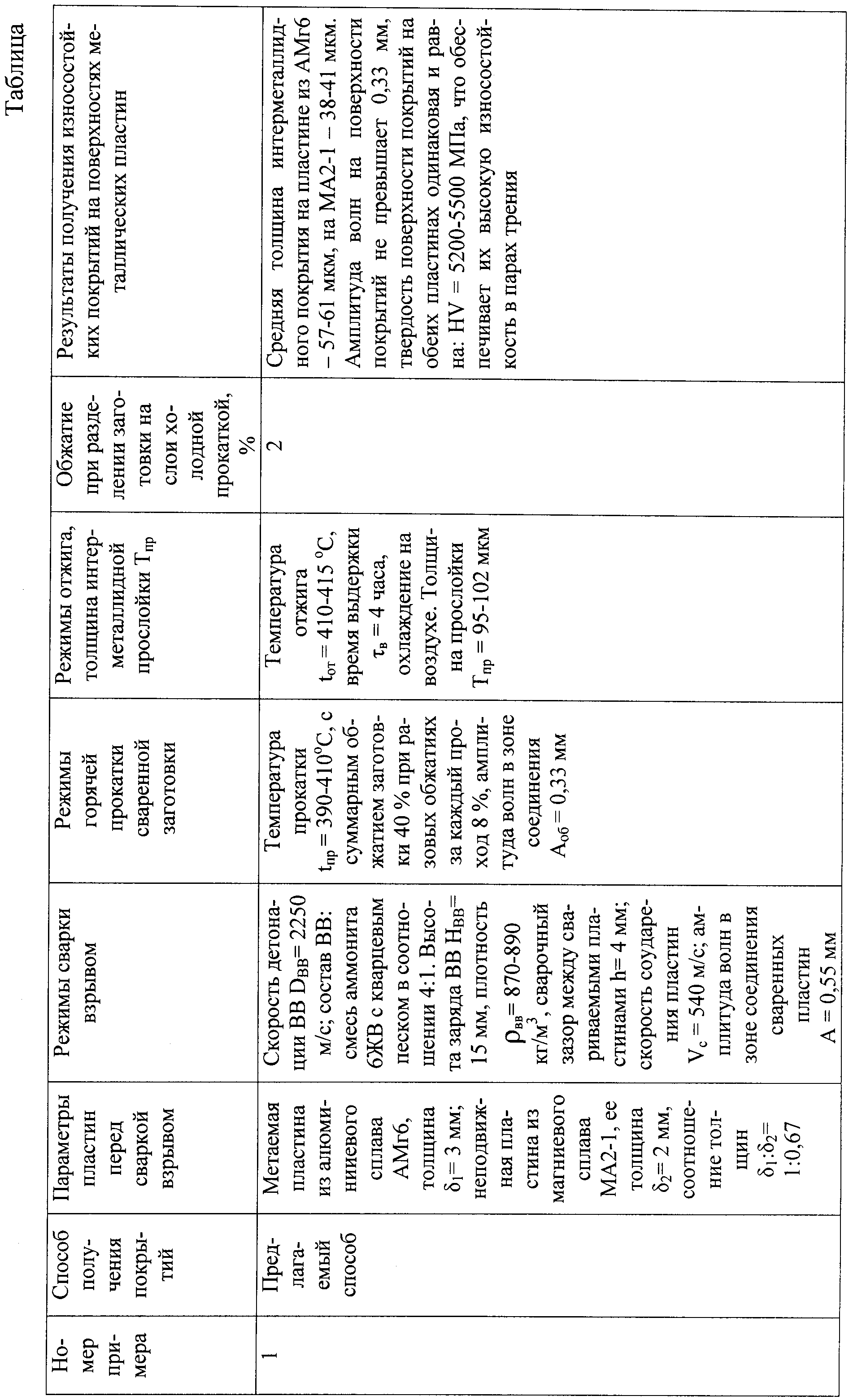 Способ получения износостойких покрытий, при котором осуществляют сварку взрывом пластин из алюминия и магния, прокатку сваренной заготовки и последующую диффузионную термическую обработку для получения между металлическими слоями интерметаллидной диффузионной прослойки, отличающийся тем, что соотношение толщин пластин из алюминия и магния при толщине пластины из алюминия, равной 2-3 мм, выбирают равным 1:(0,67-3), сварку взрывом осуществляют при скорости детонации взрывчатого вещества 2250-3000 м/с, при этом высоту заряда взрывчатого вещества и сварочный зазор между свариваемыми пластинами выбирают из условия скорости соударения пластин, равной 540-650 м/с, затем сваренную заготовку подвергают горячей прокатке при температуре 390-430°C с суммарным обжатием 40-70% при разовых обжатиях за каждый проход, равных 8-10%, после чего полученную заготовку нагревают до температуры 410-430°С, выдерживают при этой температуре в течение 4-9 ч для образования в зоне соединения металлических слоев сплошной высокотвердой интерметаллидной диффузионной прослойки, а затем заготовку охлаждают на воздухе и подвергают холодной прокатке с обжатием 2-4% для отделения алюминиевого слоя от магниевого по диффузионной интерметаллидной прослойке с формированием при этом на пластинах из алюминия и магния высокотвердых износостойких покрытий.
