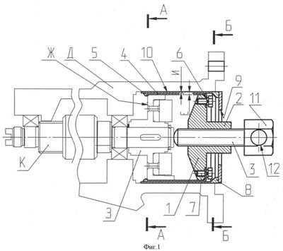 После этого вращают винт 3 гаечным ключом или за отверстие 12 в головке винта цилиндрической ручкой (не показана). Вначале винт упирается в торец червяка К, а при дальнейшем вращении он начинает перемещать траверсу 1 с захватами 4 до упора в торец Ж полумуфты. При дальнейшем вращении винта траверса 1 с захватами 4 и полумуфтой перемещаются до снятия последней с червяка редуктора.