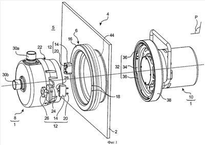 Таким образом, четыре спиралевидные рампы, а также четыре выступа 36, которые расположены симметрично и каждый из которых имеет по существу форму кольцевого участка, позволяют обеспечить крепления байонетного типа между ведущей деталью 10 и шлюзовым цилиндром 6 путем его простого поворота вручную точно так же, как проводится хорошо известное специалистам крепление наружного предохранительного кольца на этом же цилиндре 6.