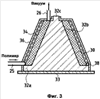 Форма, изображенная на Фиг.3, содержит элемент, или поддерживающую оснастку 32 с основанием 32а, расположенным на опоре 33, с которого выступает центральная часть 32b, имеющая наружную поверхность в форме существенно усеченного конуса, профиль которой соответствует профилю поверхности, определяющей поток газа в изготавливаемом диффузоре сопла.