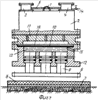 Пресс для листовой штамповки снабжен лебедкой с механизмом ее привода, блоками и тросом (на фиг.11 лебедка с механизмом ее привода, блоками и трос не показаны), связанным с проушинами 1, выполненными на верхней платформе 2, установленными на верхней платформе и заполненными взрывчатой смесью кислорода и природного газа под давлением 10-25 МПа баллонами 3, 4 с вентилями 5, 6 и редукторами, свечой зажигания (на фиг.11 редуктор и свеча зажигания не показаны), плунжерами 7, стальной плитой 8, закрепленной посредством болтов на нижних частях плунжеров, упругим материалом 9 в виде слоя толщиной 1-500 мм, стальной плитой и оснащенными вентилями 11, 12, золотниковыми клапанами 13, 14, которые установлены на фланце, выполненном на нижней платформе 15, с опорой с верхней стороны на пружины 16, 17, а с нижней стороны – на стальную плиту 8, верхняя платформа 2 соединена с нижней стороны посредством болтов со штампом-матрицей 18 и с нижней платформой 15, которая снабжена свечой зажигания (на фиг.11 свеча зажигания не показана) и выполнена с полостью 19, заполненной взрывчатой смесью кислорода и природного газа из баллонов 3, 4 верхней платформы 2 посредством вентилей 5, 6 и редукторов баллонов, рукавов, вентилей 11, 12, золотниковых клапанов 13, 14 (на фиг.11 редуктор и рукава не показаны), каналов 20, 21 в корпусах 22, 23 и золотниках 24, 25 золотниковых клапанов, штуцеров с обратными шаровыми клапанами (на фиг.11 штуцера с обратными шаровыми клапанами не показаны) и каналов 26, 27, выполненных в нижней платформе 15, и с цилиндрическими полостями, а плунжеры 7 расположены в упомянутых цилиндрических полостях нижней платформы 15 с опорой с верхней стороны на взрывчатую смесь кислорода и природного газа и с возможностью деформирования в полости штампа-матрицы 18 при перемещении верхней и нижней платформ 2, 15 и штампа-матрицы 18 вниз и удара стальной плиты 8 по слою упругого материала 9, стальной плите 10, слою песка или пескогравия толщиной 0.001-10 м и грунту 1-10 листов 26 с размещением между деформируемыми листами, а также между верхним из них и поверхностью штампа-матрицы слоя смазки.