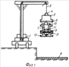 Пресс в собранном виде лебедкой (на фиг.12 лебедка не показана) поднимается на определенную высоту и сбрасывается вниз. В момент удара штампа-матрицы 4 по упругому материалу 5, слою песка и породе нижний штамп-матрица 4 мгновенно останавливается, а платформа 2 и верхний штамп 3 с пуансоном, перемещаясь вниз, вдавливает деформируемые листы 6 в полость матрицы 4.
