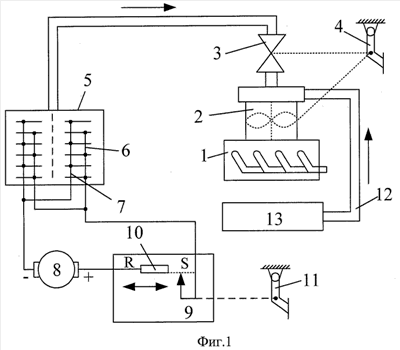 Энергетическая установка транспортного средства, принятая за прототип (А.с. 1088959, МПК B60K 15/10, 30.04.1984, бюл. 16. Энергетическая установка транспортного средства), содержащая двигатель внутреннего сгорания, к карбюратору которого через управляемый клапан подсоединено электрическое устройство для выделения из жидкости горючей газовой смеси, подключенное к источнику питания посредством переключателя режимов. Упомянутое устройство представляет собой электролизер, а источник питания – тормоз замедлитель. Энергетическая установка транспортного средства прототипа (показана на фиг.1) состоит из двигателя внутреннего сгорания 1 с карбюратором 2, к которому через управляемый клапан 3, связанный с педалью 4 привода дросселя карбюратора 2, подсоединен электролизер 5, содержащий катодные 6 и анодные 7 электроды, выполненные, например, из волокнистого углеграфита. Электроды 6 и 7 электролизера 5 подключены к обмоткам электромагнитного тормоза-замедлителя 8 через переключатель 9 режимов, который состоит, например, из выключателя с реостатом 10, кинематически связанного с педалью 11 тормоза. Кроме электролизера карбюратор 2 также соединяется топливопроводом 12 с основным топливным баком 13. Устройство прототипа работает следующим образом. Электролизер перед движением автомобиля заправляется электролитом, которым служит водный раствор солей металлов – отходы химических производств. При неравномерном движении автомобиля с частыми торможениями и ускорениями водитель воздействует на тормозную педаль 11, возвращая педаль 4 в исходное состояние. Тогда управляемый клапан 3 закрывается, а переключатель 9 режимов подключает электромагнитный тормоз 8 к электролизеру 5 за счет срабатывания выключателя на реостате 10 под действием педали 11. При дальнейшем нажатии на педаль 11 происходит перемещение движка потенциометра 10, что приводит к увеличению тока в обмотках электромагнитного тормоза 8 и в электролизере 5. Электромагнитный тормоз-замедлитель создает тормозной момент автомобилю, а в электролизере возникает бурное выделение кислородно-водородной горючей газовой смеси, которая запасается в корпусе электролизера 5, так как управляемый клапан 3 закрыт. Кроме этого, в зависимости от состава электролита, на электродах 6 и 7 электролизера выделяются ценные металлы. После торможения автомобиля водитель нажимает на педаль 4, переключатель 9 режимов принимает исходное положение, и отключается электромагнитный тормоз. Одновременно открывается управляемый клапан 3 и в режиме ускорения автомобиля горючая смесь основного топлива снабжается кислородно-водородными добавками. Расход основного топлива автомобиля сокращается, снижается токсичность выхлопных газов. Энергетическая установка прототипа работает только при движении транспортного средства с частыми торможениями и ускорениями в условиях городских дорог. В этом ее существенный недостаток.