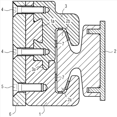Чертеж показывает базовую часть 1 держателя контактного рельса, которая имеет выемку для приема первого приформованного участка 2а контактного рельса 2. Для монтажа контактный рельс 2 вкладывают в выемку базовой части 1. Вдвижная часть 3 имеет выемку для приема второго приформованного участка 2b контактного рельса 2. Эта вдвижная часть 3 является надвигаемой на базовую часть 1 в направлении контактного рельса 2. Для этого формы базовой части 1 и вдвижной части 3 заходят в зацепление друг в друга с геометрическим замыканием. Базовая часть 1 в форме выполнения имеет приформованный участок в виде ласточкина хвоста 1а, который охватывается с геометрическим замыканием монтированной вдвижной частью 3. Кроме того, вдвижная часть 3 заходит направляющей цапфой 3а в соответствующий направляющий паз базовой части 1.