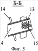 Для перевода устройства в нерабочее положение оператор педалью 11 поворачивает вал 10 до опирания педали на пол вагона, что обеспечивает выход вала из контакта с боковой частью направляющей 7. При этом С-образный зацеп вала 9 выходит из зацепления с направляющей 7, а наружный конец штанги 6 получает возможность перемещения вдоль нее. Далее, используя подножку 5, оператор выдвигает скобу 1 из зазора между колесом и кузовом на наружный конец штанги 4, поворачивает штангу до выхода вала 13 из зацепления с направляющей 8, и, перебросив внутренний конец штанги через направляющую 8 (за счет вертикального перемещения вокруг шарика на валу 9), поворачивает ее до зацепления крюка 14 с наружной направляющей 7. В процессе поворота освободившийся внутренний конец штанги опирается на нижнюю часть крюка 14 (фиг.4), удерживая штангу в горизонтальном положении и исключая при этом заклинивание наружного конца штанги 4 на валу 9. При этом имеющийся на штанге фиксатор 15 (фиг.3 и фиг.5) в процессе поворота штанги в рабочее положение ориентирует вал 13 его С-образным зацепом на горизонтальную полку направляющей 8, предотвращая возможность самопроизвольного разворота вала в нерабочее положение.