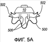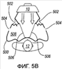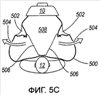 Чертежи, изображенные на фиг.5А-5С, иллюстрируют три этапа раскрывания для приведения в действие воздушной подушки 500 безопасности без наличия препятствия на пути раскрывания. Изображенная графически воздушная подушка 500 безопасности включает в себя два затягивающих патрубка 502, симметрично расположенные на воздушной подушке 500 безопасности, и в ней выполнены симметрично расположенные два выпускных отверстия 504. Выпускные отверстия 504 обеспечивают выпуск воздуха из воздушной подушки 500 безопасности, и они не ограничены положением пользователя автомобилем. Выпускные отверстия 504 могут избирательно использоваться при определенных вариантах воплощения воздушной подушки безопасности на основе имеющихся потребностей в выпуске воздуха. Местоположения затягивающих патрубков 502 и отверстий 504 могут меняться, как это осуществляется набором затягивающих патрубков 502 и отверстий 504. Пользователь 12 автомобилем находится в нормальном сидячем положении, которое позволяет полностью расширяться воздушной подушке 500 безопасности перед соударением с ней пользователя автомобилем. Таким образом, пользователь 12 автомобилем освобождается от возможности полного ограничения воздушной подушкой 500 безопасности.