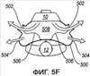Чертежи, изображенные на фиг.5D-5F, иллюстрируют три этапа раскрывания воздушной подушки 500 безопасности с препятствием на пути раскрывания. Пользователь 12 автомобилем находится в смещенном положении, и он сталкивается с преградой в виде раскрывающейся воздушной подушки 500 безопасности, и этим предотвращается полное надувание этой подушки 500. На чертеже, изображенном на фиг.5D, воздушная подушка 500 безопасности начинает раскрывание таким же образом, как это показано на чертеже, изображенном на фиг.5А. На чертеже, изображенном на фиг.5Е, показано, что воздушная подушка 500 безопасности ударяет пользователя 12 автомобилем и остаются слабо натянутыми затягивающие кордные шнуры 506. Закрывающие патрубки 502 остаются в неперекрытом положении, и происходит быстрый отвод воздуха из патрубков 502 и отверстий 504. Надувание подушки является ограниченным, но пользователь 12 автомобилем принимает меньший удар, чем в случае полного раскрывания подушки 500. На чертеже, изображенном на фиг.5F, показано, что подушка 500 находится в частично надутом положении и обеспечивает наличием лимитированного ограничения. Выпуск воздуха продолжается через патрубки 502 и отверстия 504.