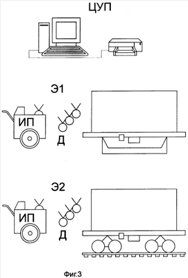 Испытание проводилось в два этапа. Первый этап относится к вагону, снятому с тележек, а второй – к вагону, установленному на тележки. В верхней части схемы на фиг.3 надпись ЦУП и изображения компьютера и принтера обозначают центральную управляющую позицию. Ниже надписи Э1 и Э2 обозначают соответственно первый и второй этапы испытаний. Надписи ИП расположены на условных изображениях измерительной позиции, снабженной радиомодемом (условно изображен как «V»), Буквы «Д» расположены возле условных изображений групп датчиков, снабженных радиомодемами. На первом этапе (Э1) справа схематично изображен вагон без тележек на стапеле. На втором этапе (Э2) справа схематично изображен вагон на тележках на участке пути.