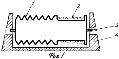 Вариант на Фиг.2 состоит из мембранной коробки 5, на боковой поверхности которой намотана нить 6, а снизу на мембране имеется шпенек 3. Между мембранной коробкой и основанием 4 имеется выталкивающая пружина 7.