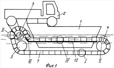 В качестве прототипа выбрана водосухопутная повозка (судно), содержащая корпус (2), на котором установлен привод (7), в днищевой части которого установлена зубчатая звездочка (4) с тяговыми цепями (6), снабженными траками (SU 8807 A1, B60F 3/00, 15.09.1924, фиг.1, всего 2 с.).