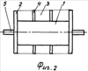 Работает движитель следующим образом. При работе двигателя – 15 вращается вал – 16 и шестерни редуктора – 17 (смотри фиг.5), от редуктора движение передается на вал – 18 и шестерни – 19. Вал – 18 устанавливается параллельно ведущему валу – 5 гребного цилиндра. От шестерен – 19 вращаются шестерни – 20, передающие вращение двум коротким валам – 21, и шестерни – 22, которые соединены с шестернями – 6 ведущего вала – 5. При вращении вала – 5 вращаются насаженные на него диски – 2. Жестко соединенный с дисками вращается и цилиндр с насаженными на него лопастями – 3. Вращаясь, лопасти прогоняют через движитель набегающий поток и ускоряют его. Слегка закрученный поток отклоняется от водоотбойника – 13 и устремляется в спрямляющее устройство – 15, откуда он выбрасывается из движителя назад горизонтально, не поднимая за собой волну и не закручиваясь, как при применении винтов. Движитель не затрагивает на это излишней энергии. Лопасти винта изогнуты по дуге так, что плавно как входят, так и выходят из воды, не ударяясь о воду, как плицы у гребного колеса. Это позволяет движителю работать плавно во внеударном режиме и развивать большие обороты. Это обстоятельство позволяет применять современные высокоэффективные двигатели, что соответствует современным тенденциям двигателестроения.