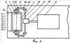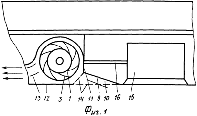 Плавность подтекания воды к гребному цилиндру обеспечивается за счет острого угла примыкания этого же листа к днищу судна. За движителем устанавливается спрямляющее устройство, состоящее из водоотбойного листа – 12 и параллельных широких пластин – 13, слегка изогнутых вверх в носовой части и параллельных водоотбойному листу в их кормовой части. На входе в движитель установлены решетки ограждения – 14. Сверху гребной цилиндр защищен кожухом.