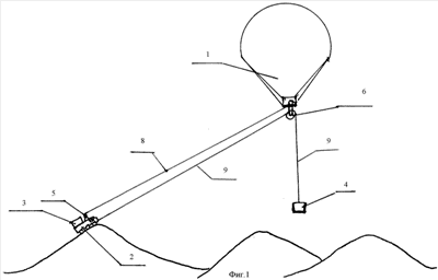 Изобретение работает так. Транспорт 2 из положения на фиг.1 спускается по склону в положение на фиг.2. При этом лебедка 5 разматывается, что обеспечивает нахождение аэростата на той же высоте. Потенциальная энергия транспорта 2 и груза 3 переходит в потенциальную энергию груза 4, груз 4 поднят в положение на фиг.2. При подъеме транспорта 2 потенциальная энергия груза 4 на фиг.2 переходит в потенциальную энергию транспорта 2 и груза 3 на фиг.1.
