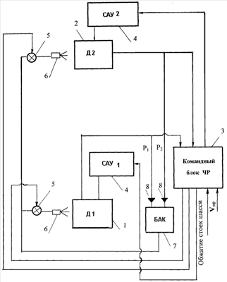 На чертеже изображена структурная схема реализации способа управления силовой установкой вертолета, содержащей два газотурбинных двигателя 1 и 2, снабженных системой впрыска воды на вход компрессора. Для реализации способа командный блок 3 должен получить одновременно на входе три сигнала для формирования на выходе сигнала о включении чрезвычайного режима. Сигнал об отказе, например, двигателя 2 подается на соответствующий вход командного блока 3 при падении давления воздуха P2 за компрессором двигателя 2 до 30%. На другой вход блока 3 подается сигнал при скорости горизонтального полета вертолета в диапазоне от нуля до заданной для данного типа вертолета величины, установленной с учетом точки принятия решения на взлет и посадку, заданных в соответствии с сертификатом летной годности. В частности, для вертолета типа Ми-8 регистрируется приведенная скорость горизонтального полета Vпр в диапазоне от нуля до 60 км/час. На третий вход подается сигнал о незагруженности шасси (об отсутствии обжатия стоек шасси).