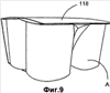Операция сгибания по существу такая же, как для первого варианта изобретения, и приводит к образованию из заготовке трубчатой коробки, окружающей изделие А. После этого первую и вторую нижние стеночные панели 112 и 122 скрепляют вместе, используя клей или другое подходящее средство, известное из уровня техники, чтобы образовать составную нижнюю стенку, показанную на фиг.8.
