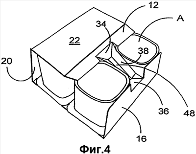 Как показано на фиг.2, верхнюю стеночную панель заготовки 10 вводят в контакт с верхней плоской поверхностью изделий А посредством их вертикального перемещения между собой. Как показано на фиг.3, заготовку 10 затем частично складывают для образования пары противоположных боковых стенок посредством сгибания боковых стеночных панелей 16, 20 внутрь по линиям сгиба 24 и 26. Соединительные стенки 34, 36 сгибают от положения, выровненного с первой нижней стеночной панелью 12 и первой боковой стеночной панелью 16, так чтобы первая нижняя стеночная панель 12 покрывала низ изделий А.