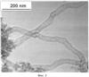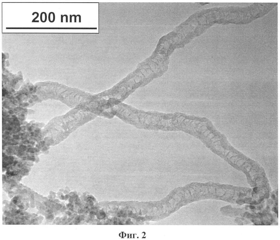 На Фиг.1 приведено электронно-микроскопическое изображение фрагмента клубка N-УНТ, приготовленных по примеру 6. Бамбукоподобная морфология нанотрубок проиллюстрирована электронно-микроскопическими снимками, представленными на Фиг.2 и 3.