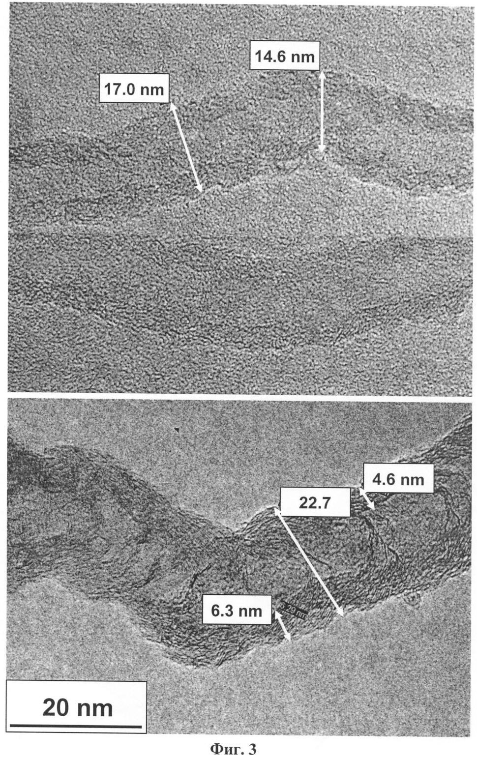 Отличается от примера 1 тем, что после того, как температура в реакторе достигает 800°С, в газовую смесь Ar/Н2 вводят пиридин и соединение железа, пропуская Ar/H2 через расположенный перед входом в реактор барботер, заполненный пиридином с растворенным в нем ферроценом. Через 135 мин подачу реагентов прекращают, реактор охлаждают в потоке Ar до комнатной температуры и высыпают покрытые углеродом гранулы Al2O3, содержащие (до) 0,1-0,2 мас.% железа (определено методами рентгенофлюоресцентного анализа и энергодисперсионного рентгеновского микроанализа).
