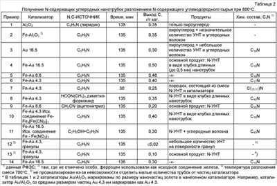 Характеристики катализаторов Au/Al2O3, условия получения N-содержащих углеродных материалов трубчатой структуры и состав продуктов приведены в таблицах 1 и 2.